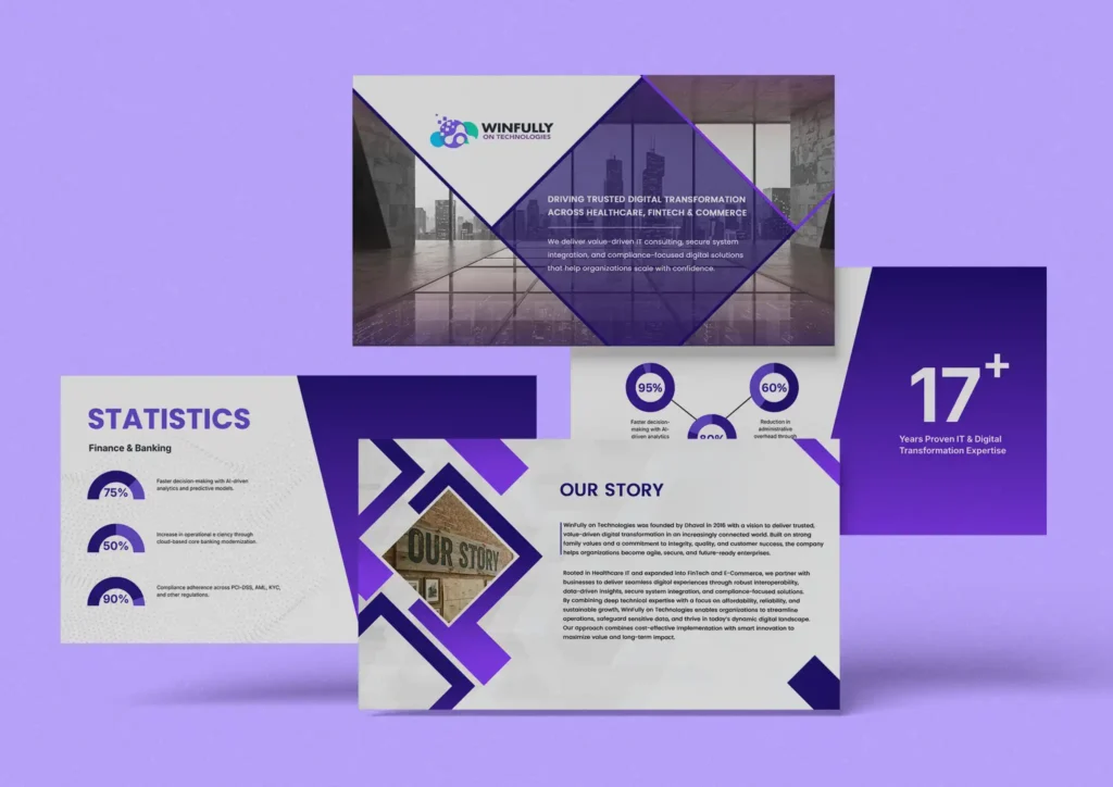 Investor decks, sales presentations, and internal business presentations designed with clear information hierarchy and visual consistency.